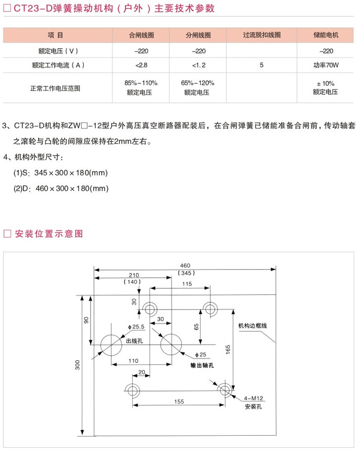 CT23型彈簧操動機(jī)構(gòu)可供操作ZW□-12/630及以下戶外高壓真空斷路器及其合閘功與之相當(dāng) 的其它高壓真空斷路器之用。CT23-S手動操動機(jī)構(gòu)具有手動儲能合閘、手動分閘、過流保護(hù)等功能。 CT23-D電動操動機(jī)構(gòu)具有電動和手動儲能、手動合分、過電流保護(hù)等功能,其機(jī)械壽命為10000次。 CT23-D電動操動機(jī)構(gòu)系我公司設(shè)計的改進(jìn)型電動機(jī)構(gòu),采用永磁直流電機(jī)、棘輪傳動儲能,動作 平穩(wěn)、可靠性高,機(jī)械性能好,使用壽命長,手動儲能手柄設(shè)置在機(jī)構(gòu)本體內(nèi),避免了原來該部件 的滲漏水環(huán)節(jié),并且由于拉環(huán)設(shè)置在機(jī)構(gòu)下部,使機(jī)構(gòu)外型更為美觀,適宜于新、老戶外10KVS上真空斷路器之用。